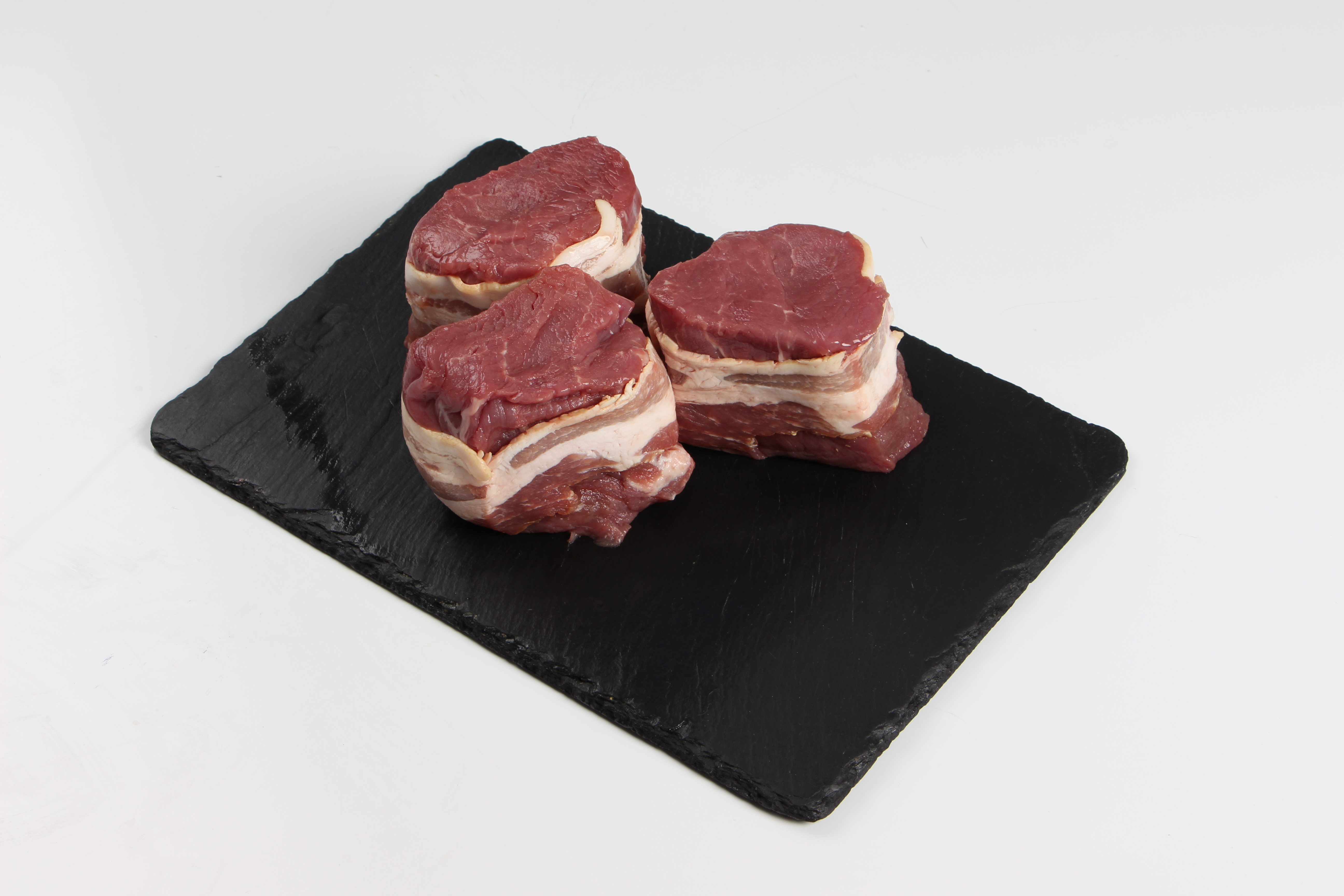 Lækre tournedos skåret af oksemørbrad, viklet med bacon.