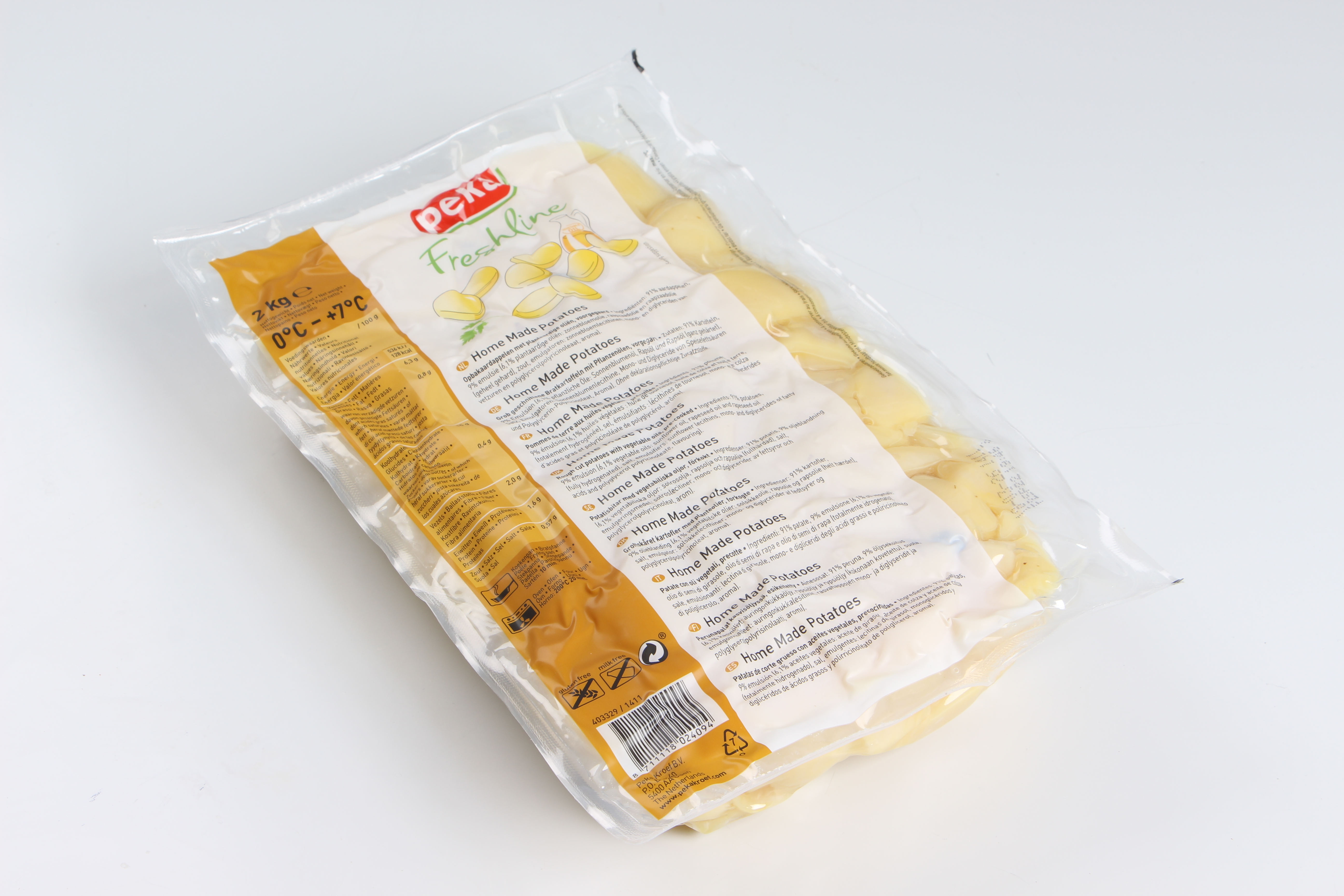 91% kartofler, 9% olieblanding (6,1% vegetabilske olier: solsikkeolie, rapsolie og rapsolie (helt hærdet), salt, emulgator: solsikkelecithiner, mono- og diglycerider af fedtsyrer og polyglycerolpolyricinoleat, aroma).